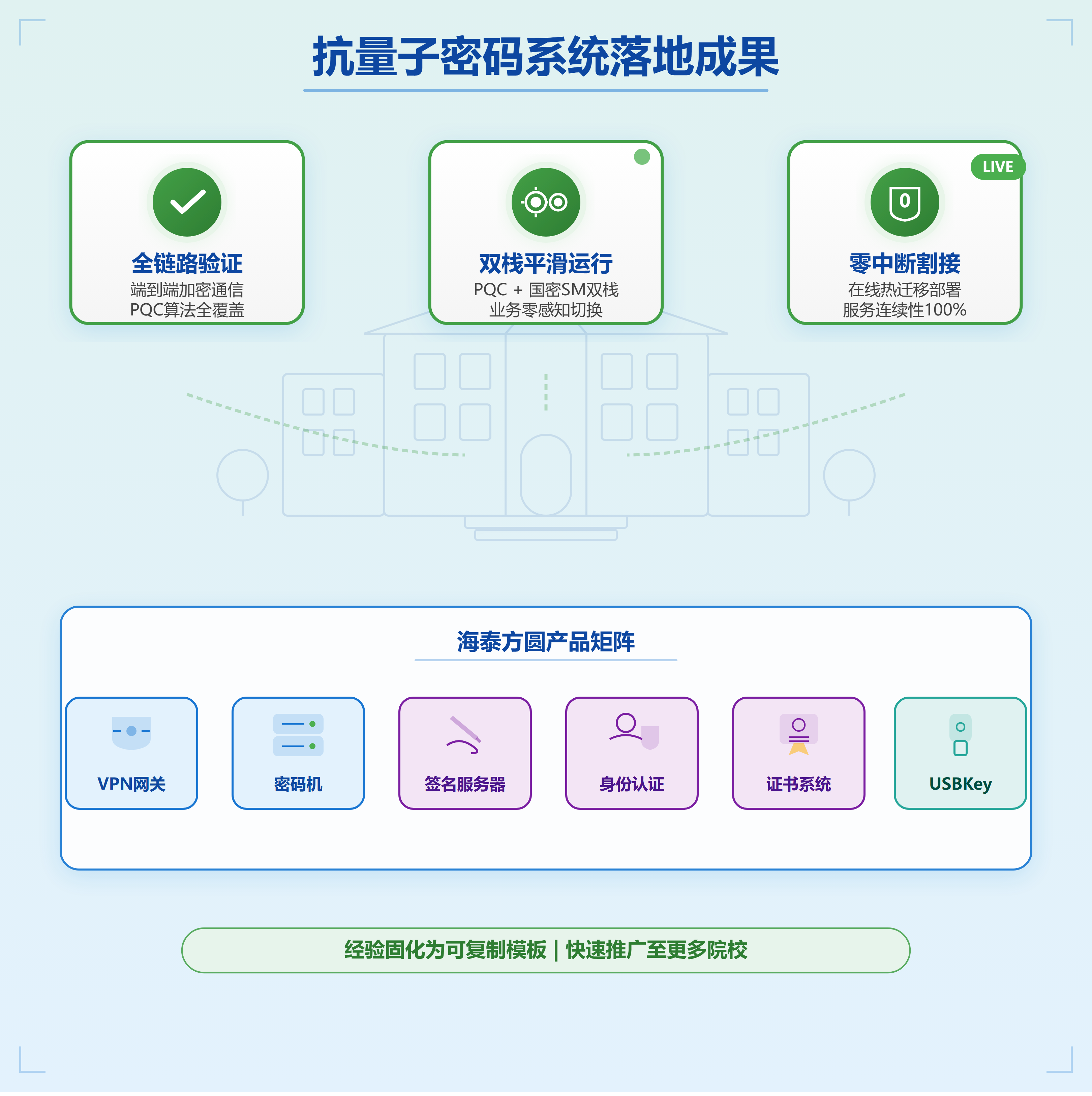 海泰方圆针对教育行业提供覆盖“统一认证、教务科研、校园网接入、教育云平台”四大核心场景的PQC迁移方案。方案采用“PQC+SM”双栈技术,为统一身份认证平台提供量子安全加固;利用抗量子签名验签服务器保障成绩单、学位证及科研文档的长期法律效力;通过抗量子SSL VPN网关与红莲花浏览器实现多终端的安全接入;并以云化密码服务支持教育云的弹性扩展。实施路径遵循“试点先行、核心优先”原则,从对外门户和身份认证入手,逐步扩展至科研与教务系统,全程保持业务透明、师生体验不变,实现教育数据的全生命周期量子防护。