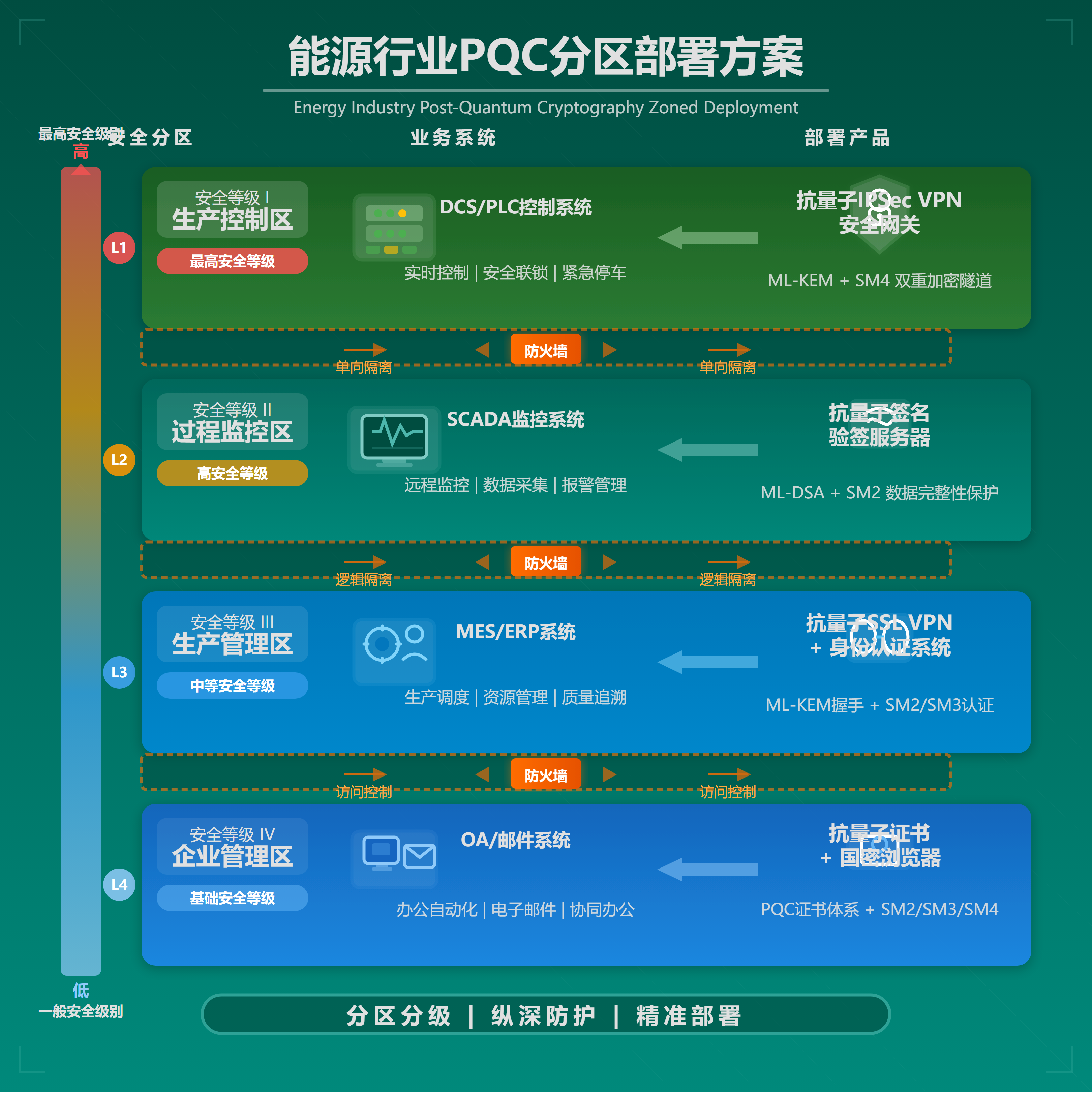 能源行业作为国家关键基础设施,面临“停不得、错不得”的严峻挑战。首先,SCADA工控系统中的油气输送、核反应堆运行等关键控制指令,若被量子算力破解并篡改,将引发灾难性安全事故。其次,油气勘探、核设施参数等战略数据需长期保存,面临“先存后破”(HNDL)攻击,即当前截获的数据在未来可能被批量解密。此外,新能源与智能电网的普及扩大了攻击面,而严格的关基保护、等保2.0及密评要求,迫使能源行业必须在绝对保障生产连续性的前提下,完成密码体系的量子安全升级。