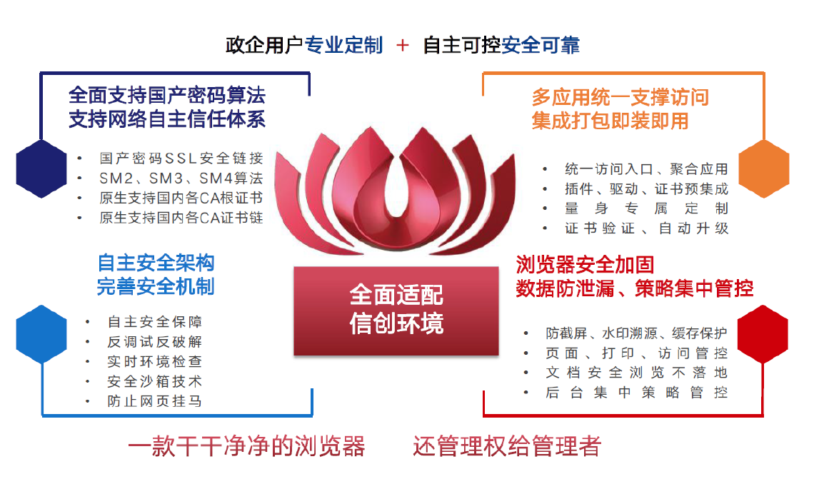红莲花国密浏览器全面支持国产密码算法和国密SSL安全链接;采用自主安全架构和完善安全机制,具有实时环境检测、安全沙箱、反调试等功能;实现多应用统一支撑访问,集成打包即装即用;支持浏览器安全加固,数据防泄漏和策略集中管控。