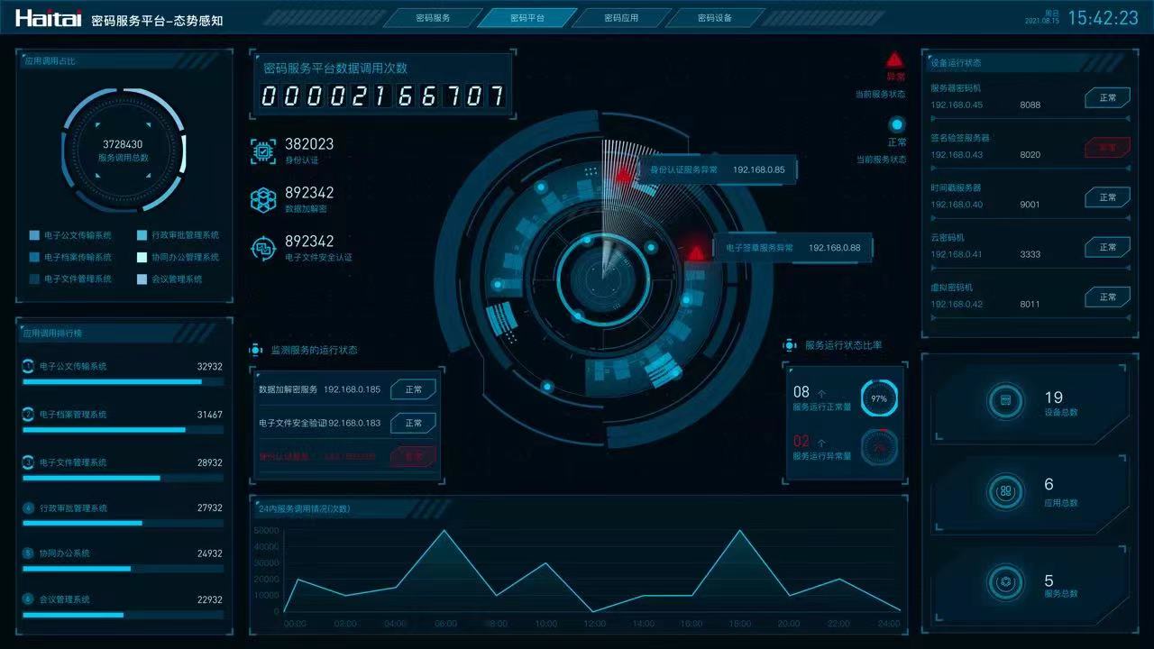 海泰密码服务平台是一个集密码服务、管理、态势感知一体化的平台,通过调用底层的各种密码软硬件资源和服务,为上层的密码应用提供统一的、完整的、可扩展的真实性、机密性、完整性和不可否认性等密码服务。密码服务平台不仅获得国密二级认证证书,具有计算机软件著作权,还是首款进入四期目录的密码服务平台产品。