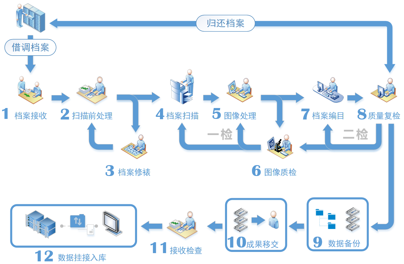 海泰档案数字化服务解决方案基本工作环节包括:数字化前处理、目录建库、档案扫描、图像处理、图像存储、数据质检、数据挂接、数据验收、数据备份等各项工作内容。数字化加工服务流程如下图所示。