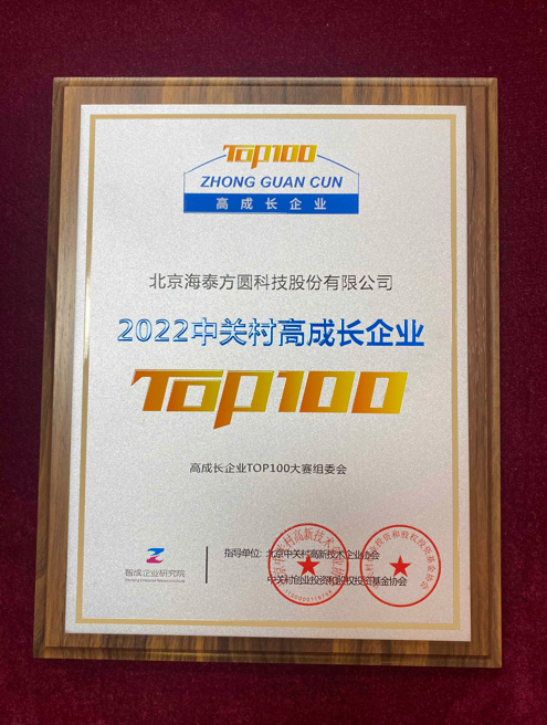 作为中关村地区标志性、品牌性活动之一,2022年度高成长企业TOP100大赛活动自2022年7月正式启动,历时5个月,经由项目征集、榜单初筛、项目初审、复审路演等四个环节,遴选出100家最具有发展潜力和行业代表性的高成长企业。海泰方圆凭借强劲的核心竞争力,从2649家入围企业中脱颖而出,一举斩获“2022中关村高成长企业TOP100”荣誉称号。