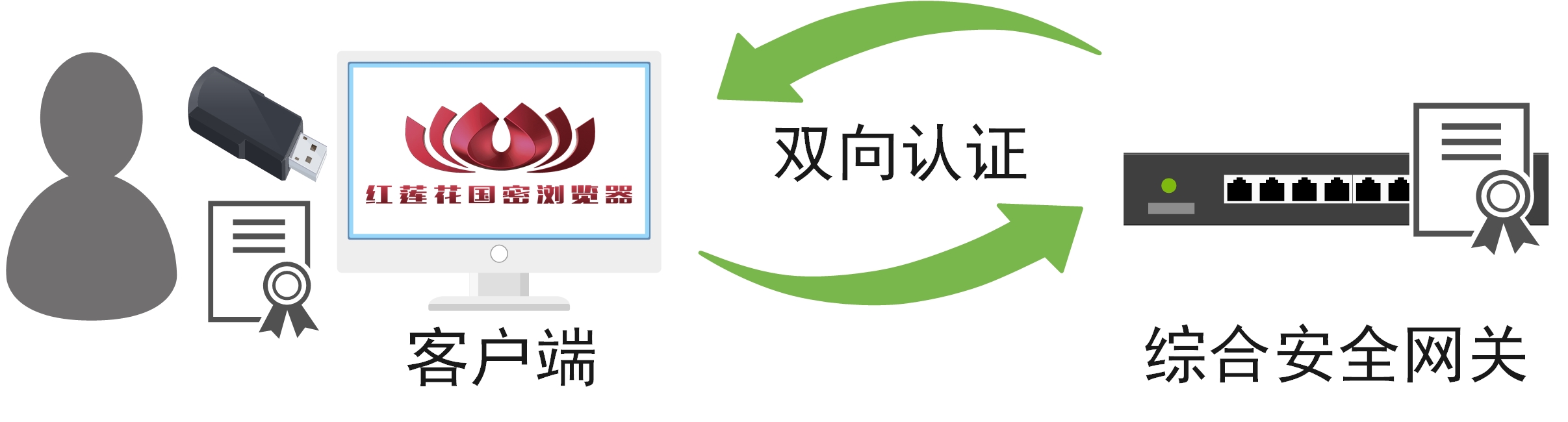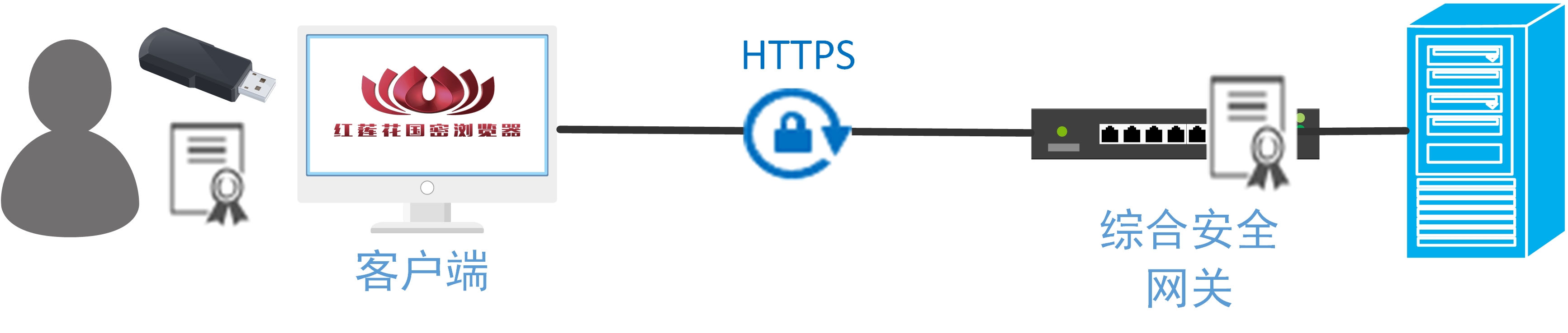 ②当客户端访问应用系统时,通过红莲花国密浏览器与综合安全网关搭建基于SSL协议的安全传输隧道,实现通道中传输的数据的机密性与完整性。