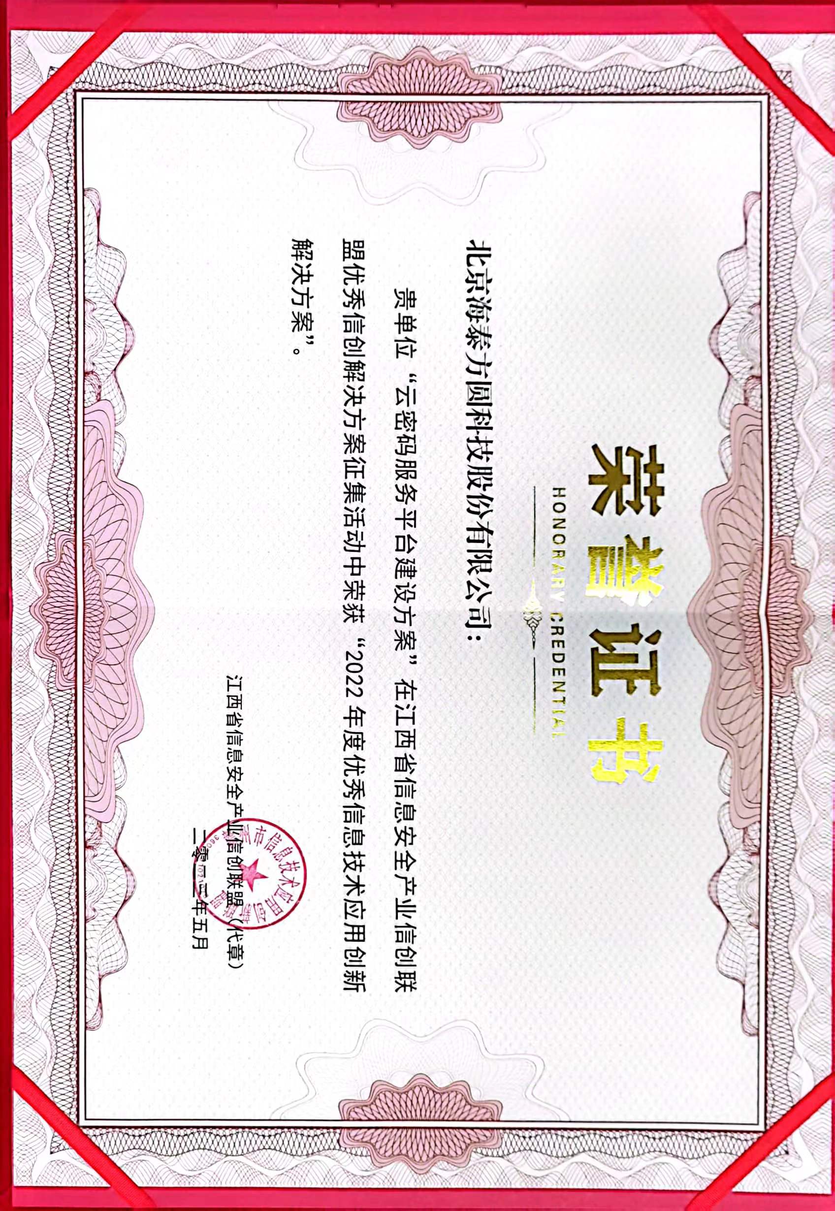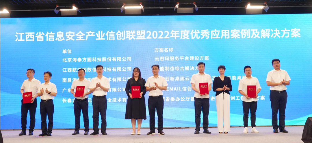 会上发布了江西省信息安全产业信创联盟年度优秀应用案例及解决方案。海泰方圆申报的云密码服务平台建设方案,荣获“2022年度优秀信息技术应用创新解决方案”。