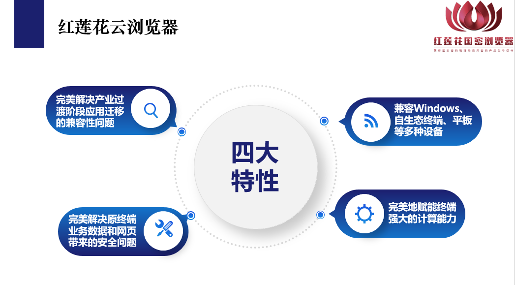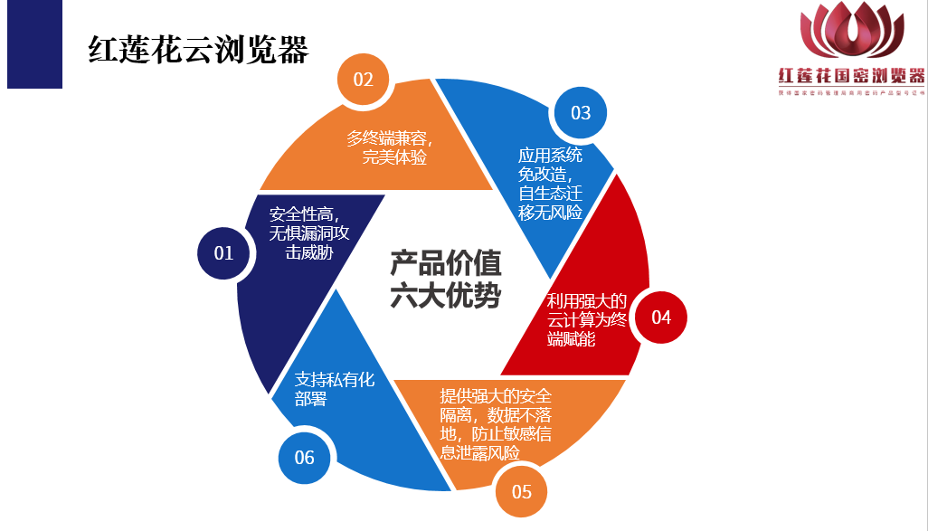 基于多年深厚的技术积淀,海泰方圆推出的红莲花云浏览器可以实现用户业务系统免改造,有效解决信创环境下大量原有基于IE等业务系统的适配问题,助力政企客户平稳完成自主创新替代过渡工作。