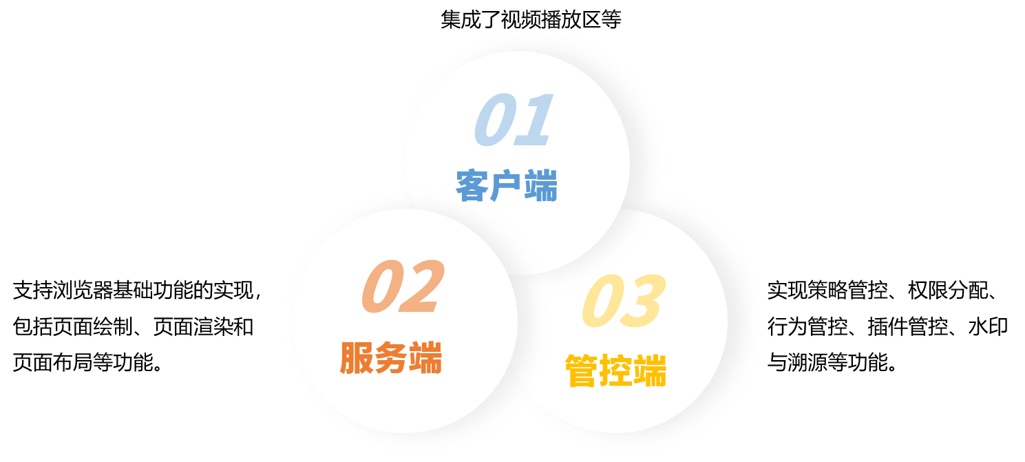 客户端、服务端、管控端三者结合实现了红莲花云浏览器完整系统,该系统可以把所有Web内容视为不受信任,把对Web的访问限制在隔离的安全域内部,解决页面运行的威胁。
