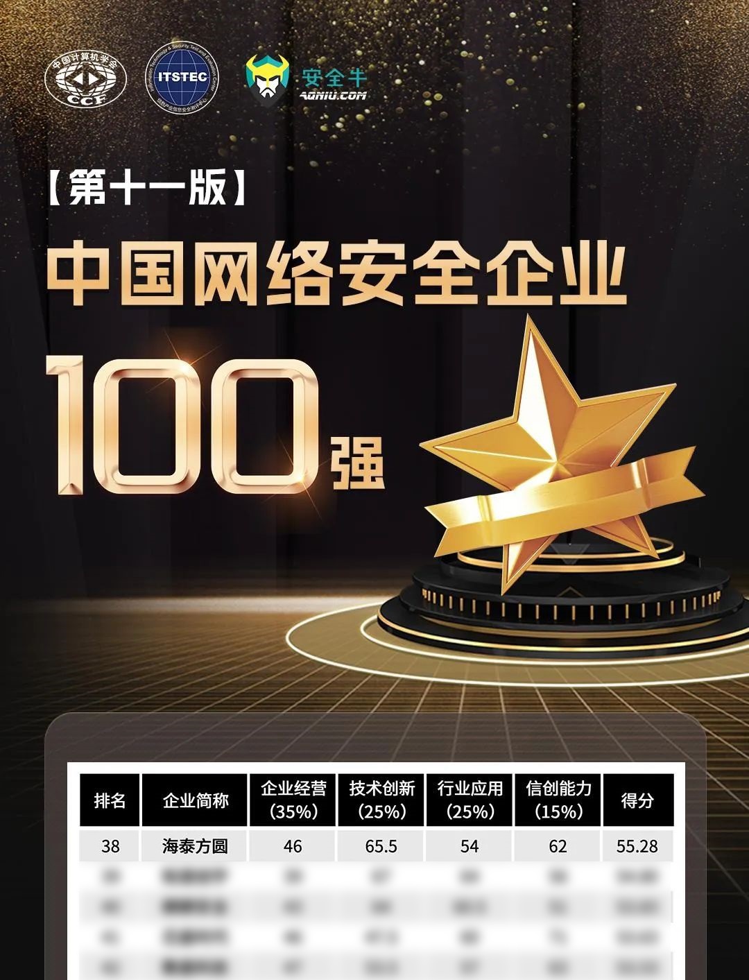 发布时间: 2023-12-13 10:3712月1日,中国计算机学会抗恶劣环境计算机专业委员会、信息产业信息安全测评中心、安全牛联合发起的第十一版《中国网络安全企业100强》正式发布,海泰方圆荣登榜单第38位。
