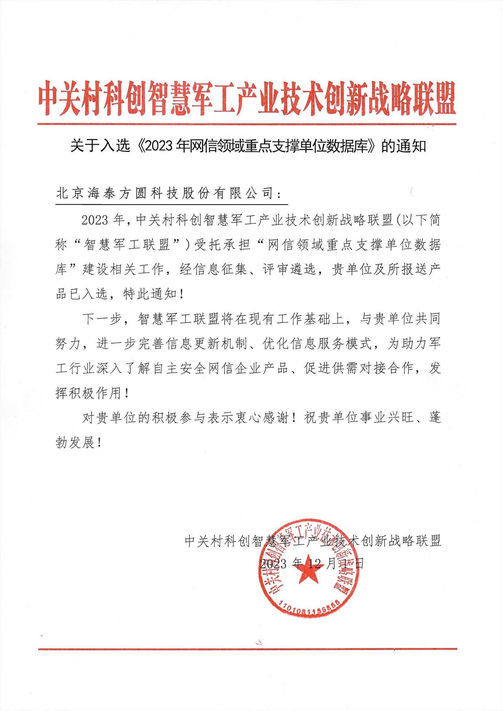 发布时间: 2024-01-03 15:34近日,中关村科创智慧军工产业技术创新战略联盟公布了《网信领域重点支撑单位数据库》名单,海泰方圆成功入选2023年网信领域重点支撑单位。