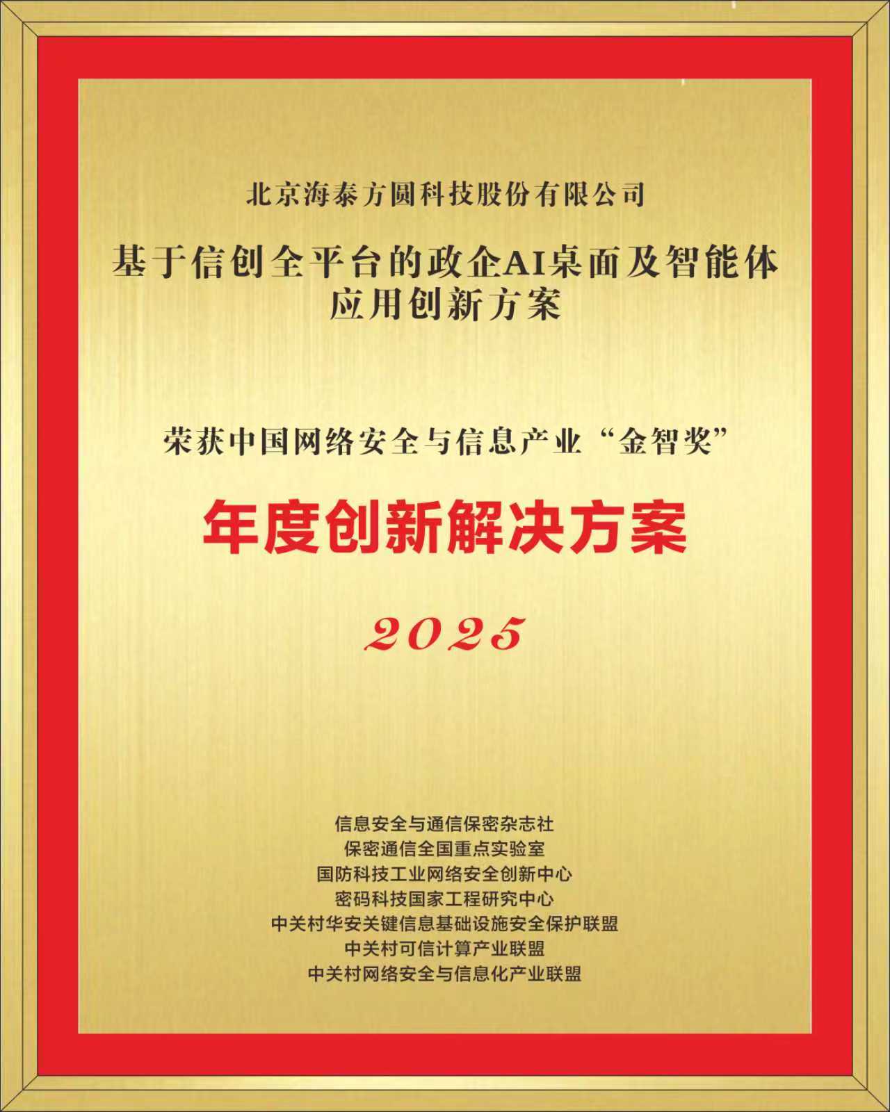此次荣获“金智奖”年度创新解决方案,既是行业对海泰方圆技术实力与产品前瞻性的高度认可,也彰显了公司在推动信创与AI深度融合方面的引领作用。未来,海泰方圆将持续深耕信创生态,助力更多政企客户跨越智能化转型门槛,在安全、高效、自主的数字新基座上,迈向高质量发展的新阶段。