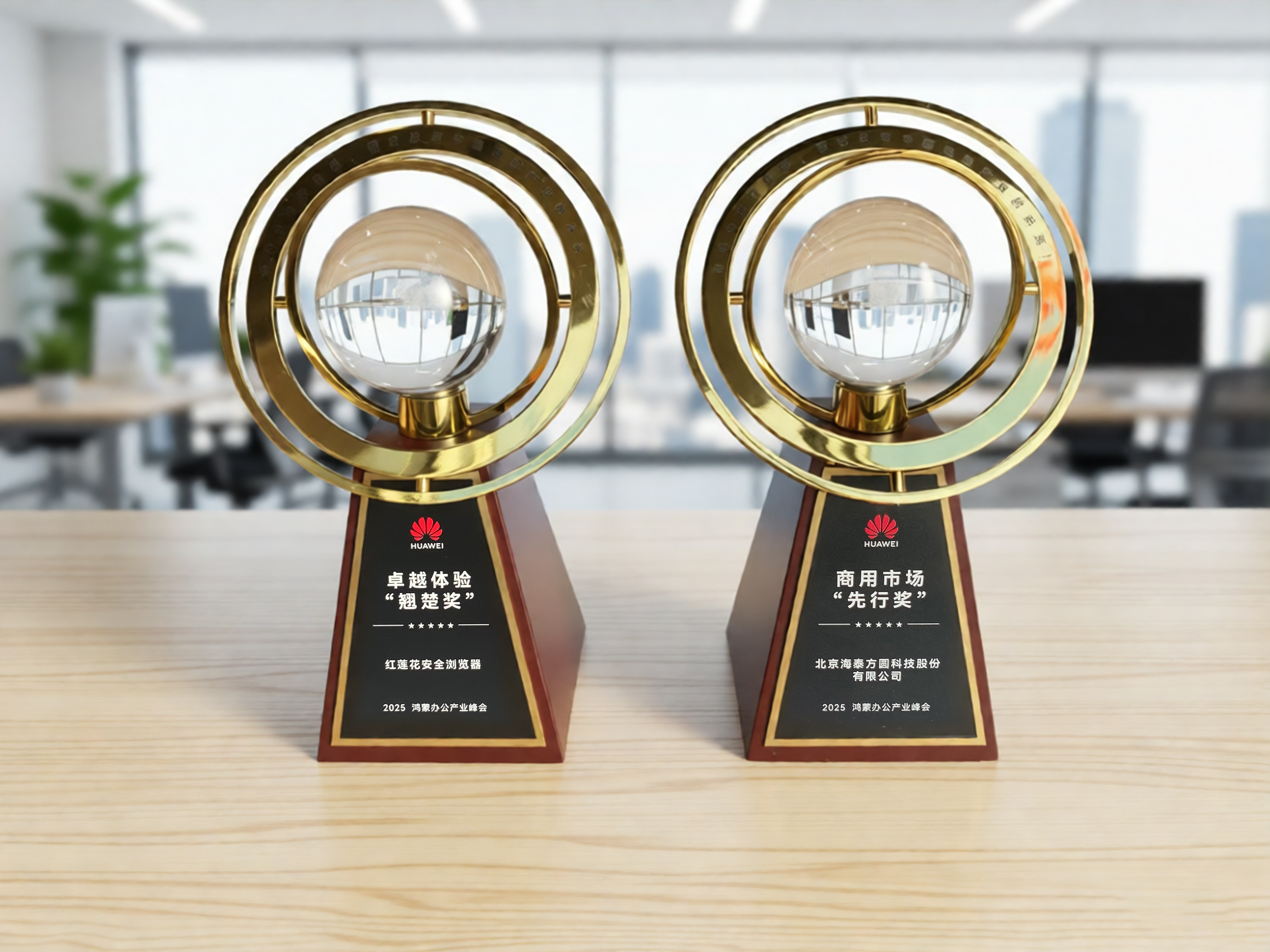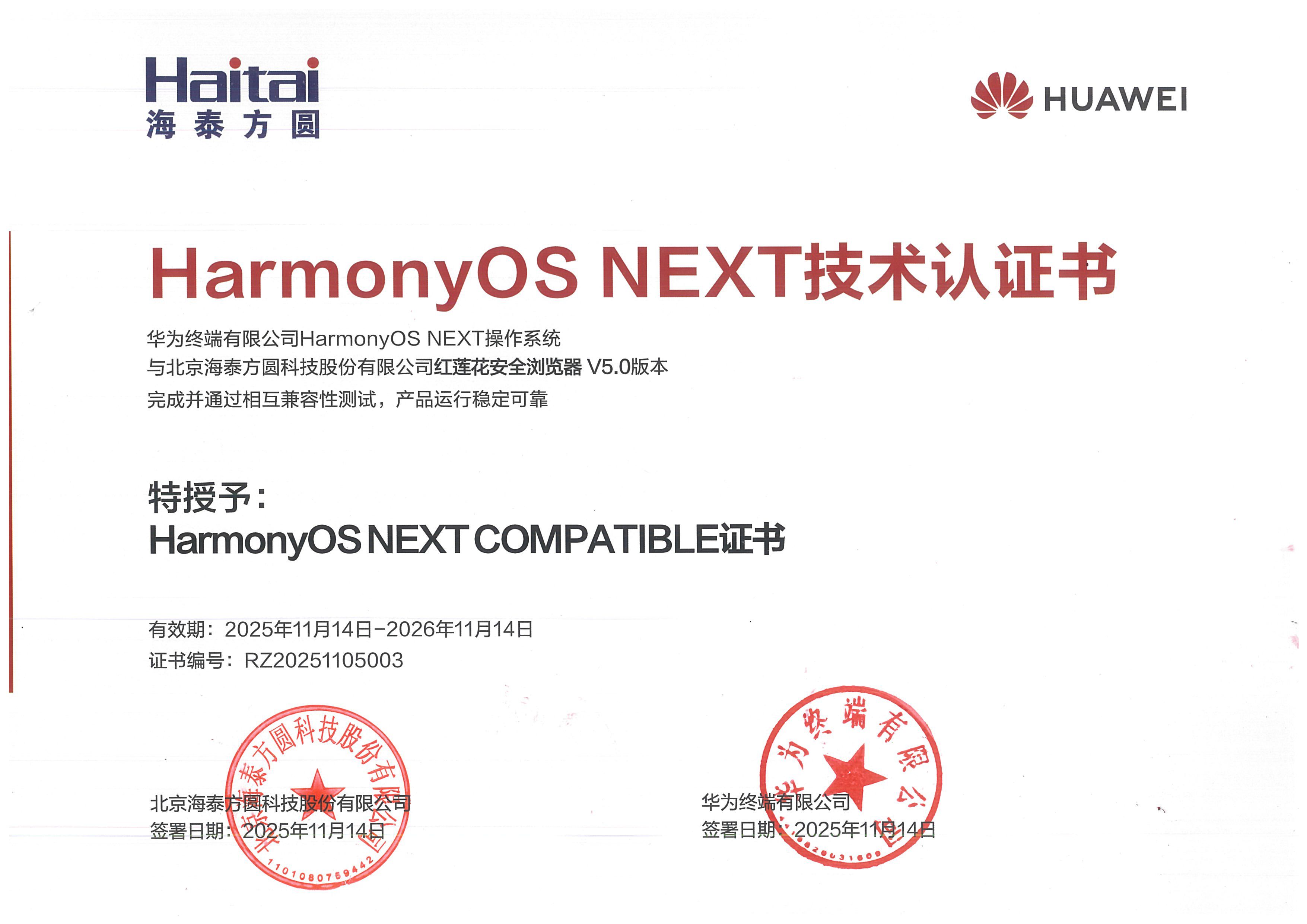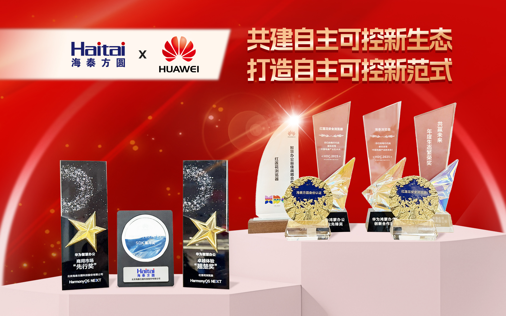 2025年6月,双方合作迈向新高度。在华为开发者大会上,海泰方圆与华为2012实验室隆重发布了《浏览器智能化》重要课题,开启了双方在技术与生态层面深度合作的新篇章。会上,红莲花鸿蒙国密浏览器以卓越的性能、流畅的体验获得了“华为鸿蒙办公卓越体验奖”,同时海泰浏览器及移动端PC端协同签名系统,一举荣获“华为鸿蒙办公创新合作奖”与“华为鸿蒙办公行业先锋奖”荣誉。
