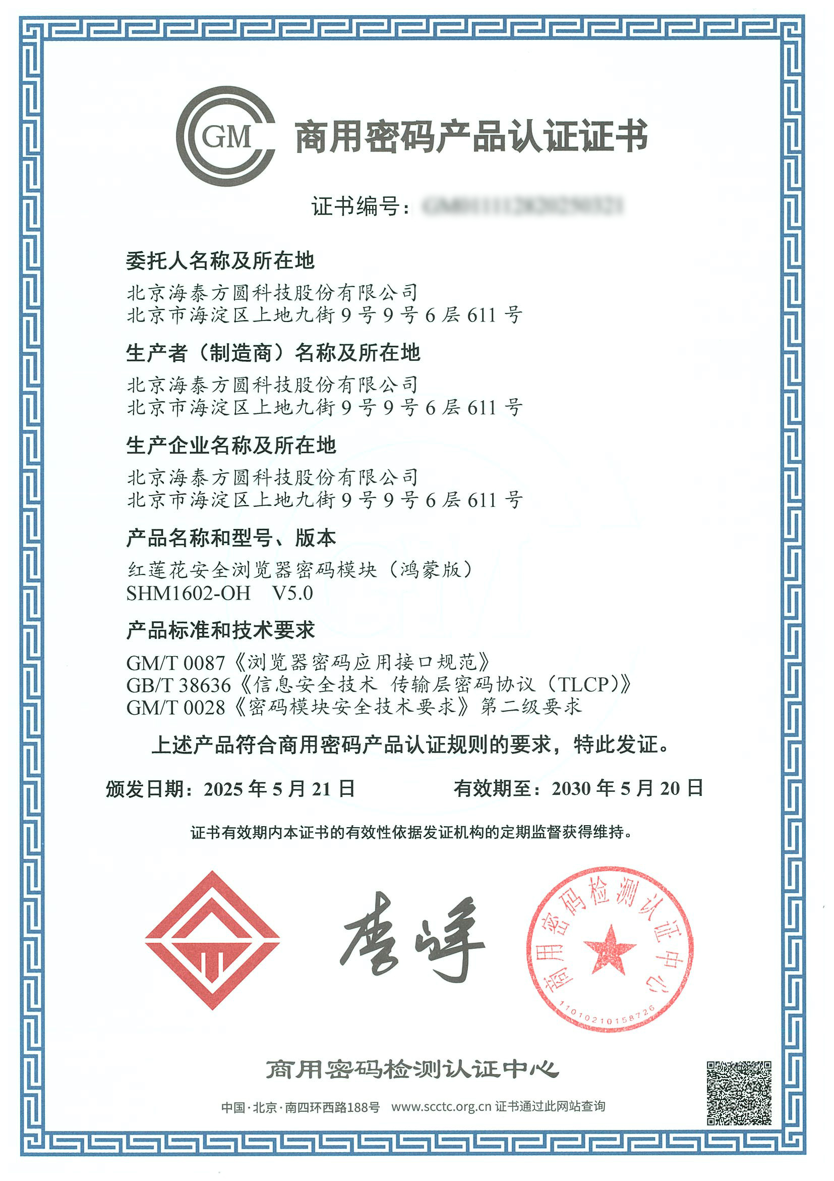 第一个获得国密局型号证书的鸿蒙系统ToB浏览器:以独立密码模块形式通过国密局认证,构建鸿蒙环境安全防护核心。