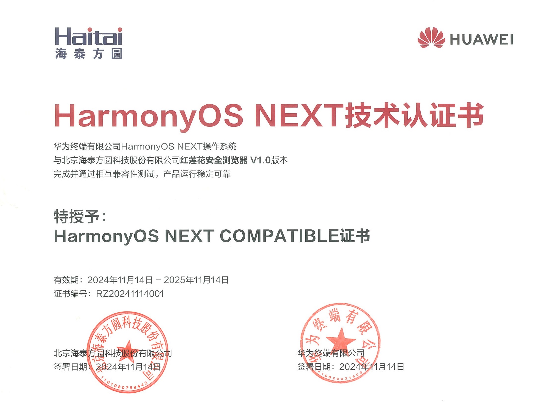 第一个获得华为鸿蒙适配认证证书:2024年11月,红莲花鸿蒙国密浏览器获得了华为鸿蒙适配认证,成为当时业内首款且唯一支持鸿蒙系统的ToB国密浏览器,真正开创了ToB浏览器在鸿蒙系统上运行的先河。
