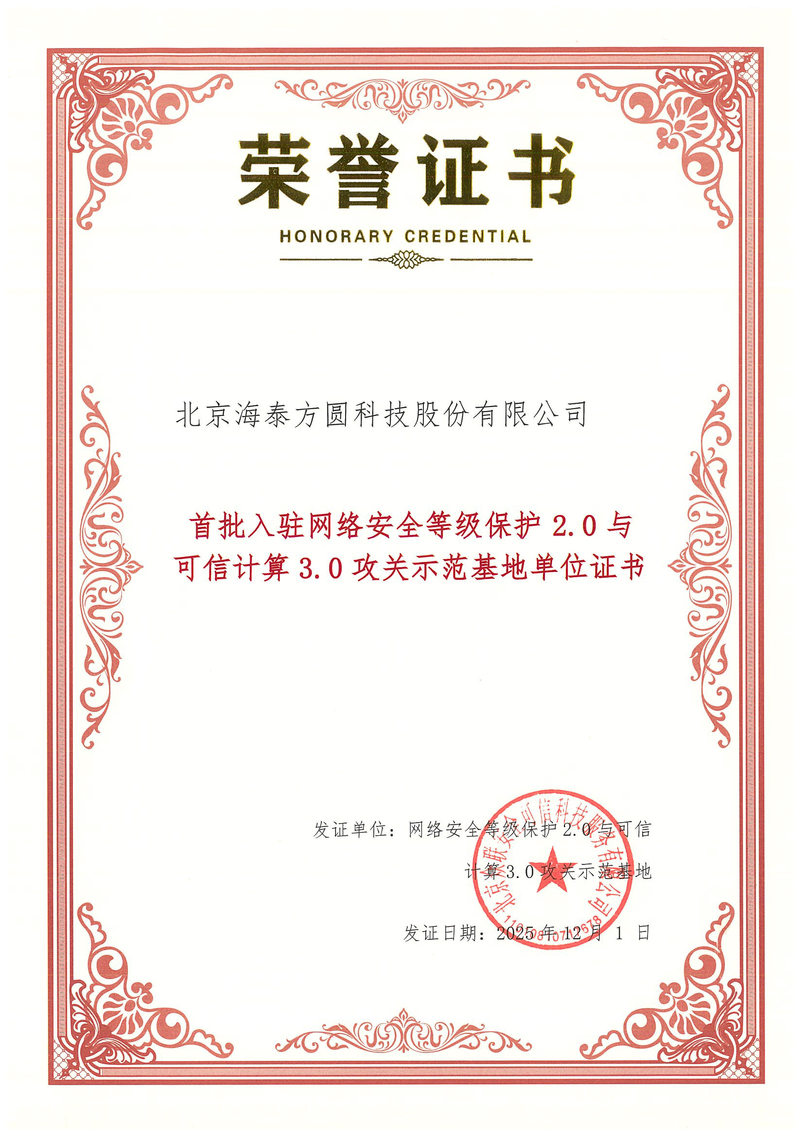 发布时间: 2025-12-30 16:52近日,2025自主可信计算创新论坛在北京成功举办。论坛围绕自主可信计算技术的前沿发展趋势、行业实践与生态系统构建等关键议题展开深入研讨,为推动构建安全、可控的数字经济新生态注入了强劲动力。会上,海泰方圆凭借在网络安全与密码应用领域的深厚积淀,成为“网络安全等级保护2.0与可信计算3.0攻关示范基地”首批入驻企业。