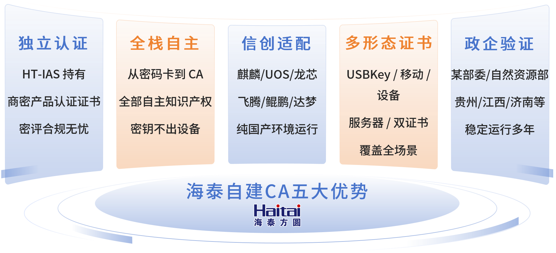不是拼凑,而是全栈交付。 从底层密码卡到上层CA系统,从桌面USBKey到移动证书,全部海泰方圆自主研发,一家厂商、一次对接、一套方案。