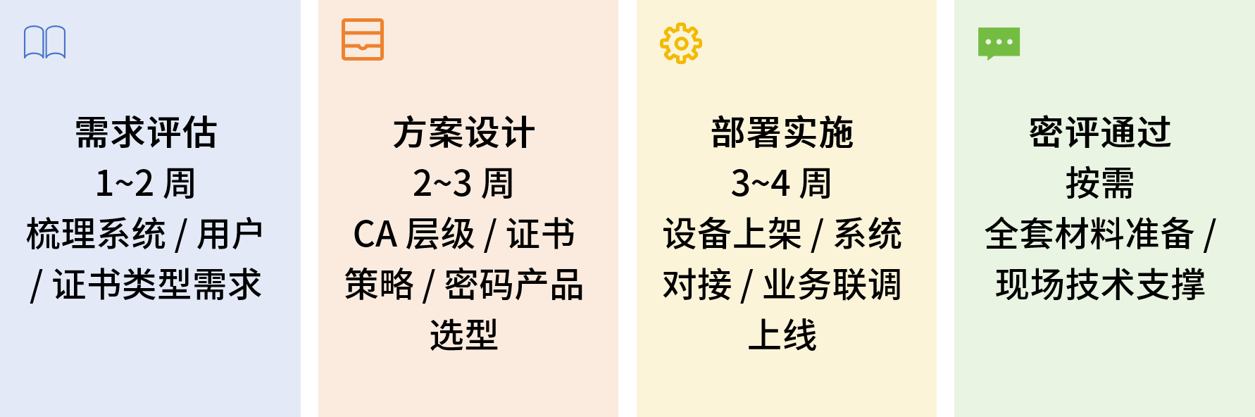 - 密评全程配合 -- 从方案评估到系统密评,全流程技术支撑