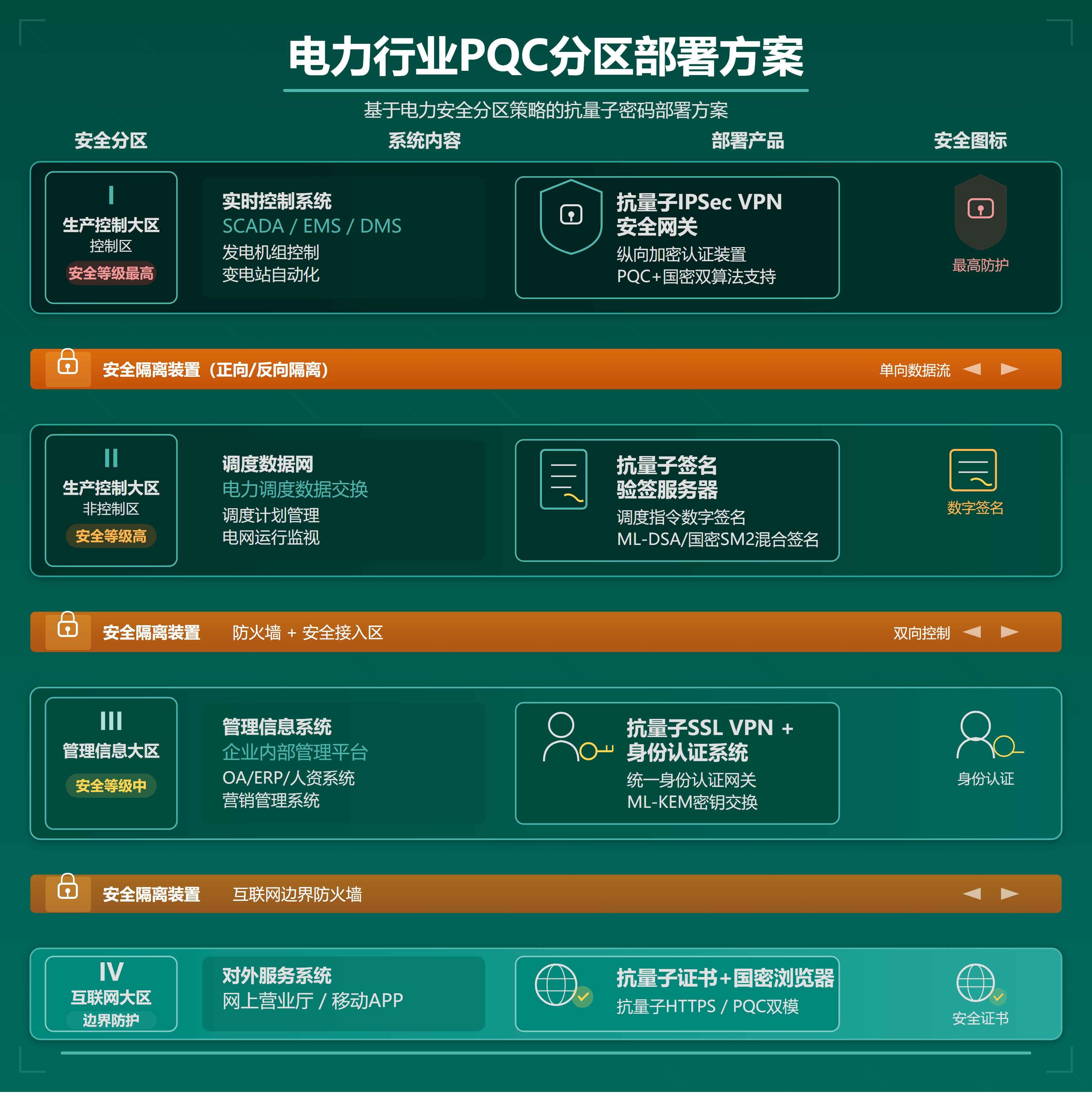安全II区(非实时控制区): 作为优先试点区域,部署抗量子VPN网关和签名验签服务器,验证方案在电力环境中的实际表现。