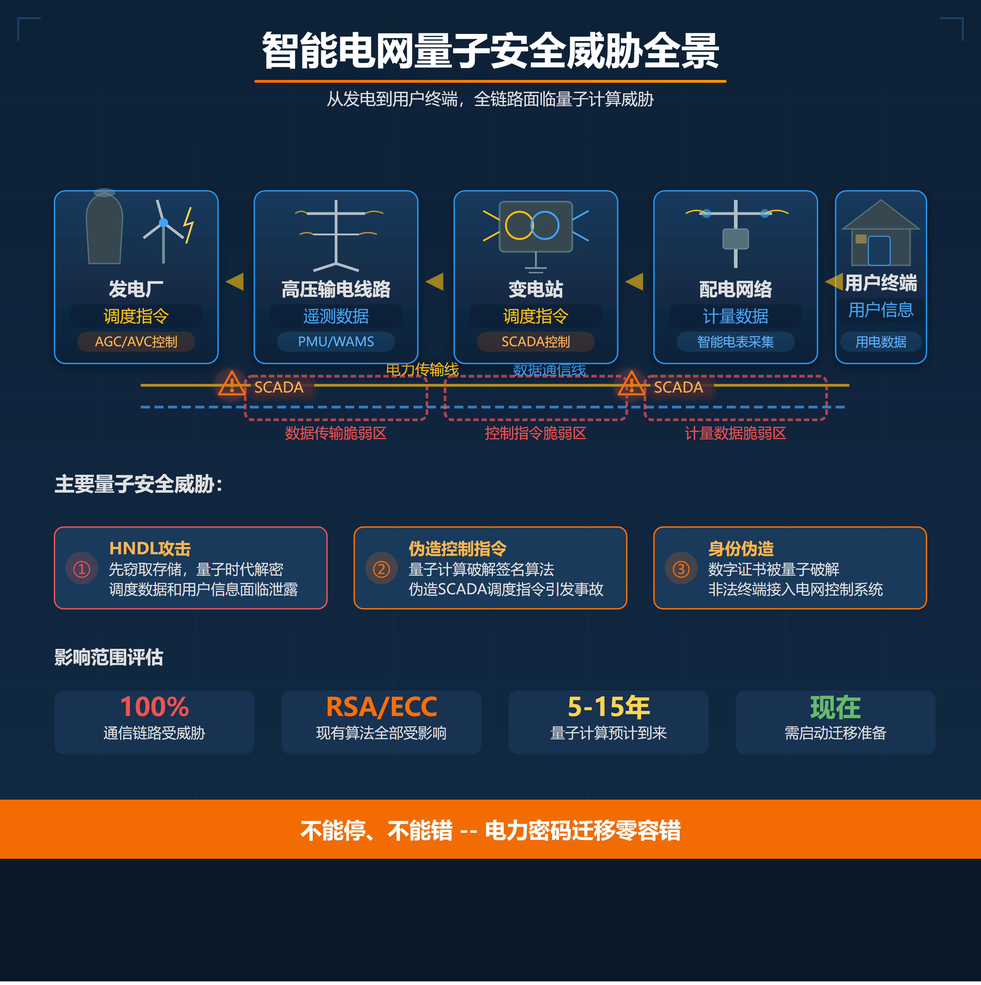 以RSA、SM2为代表的公钥密码算法在量子计算面前将被加速破解。对于电力行业这一"停不得、错不得"的关键基础设施而言,抗量子密码迁移已不是选择题,而是必答题。